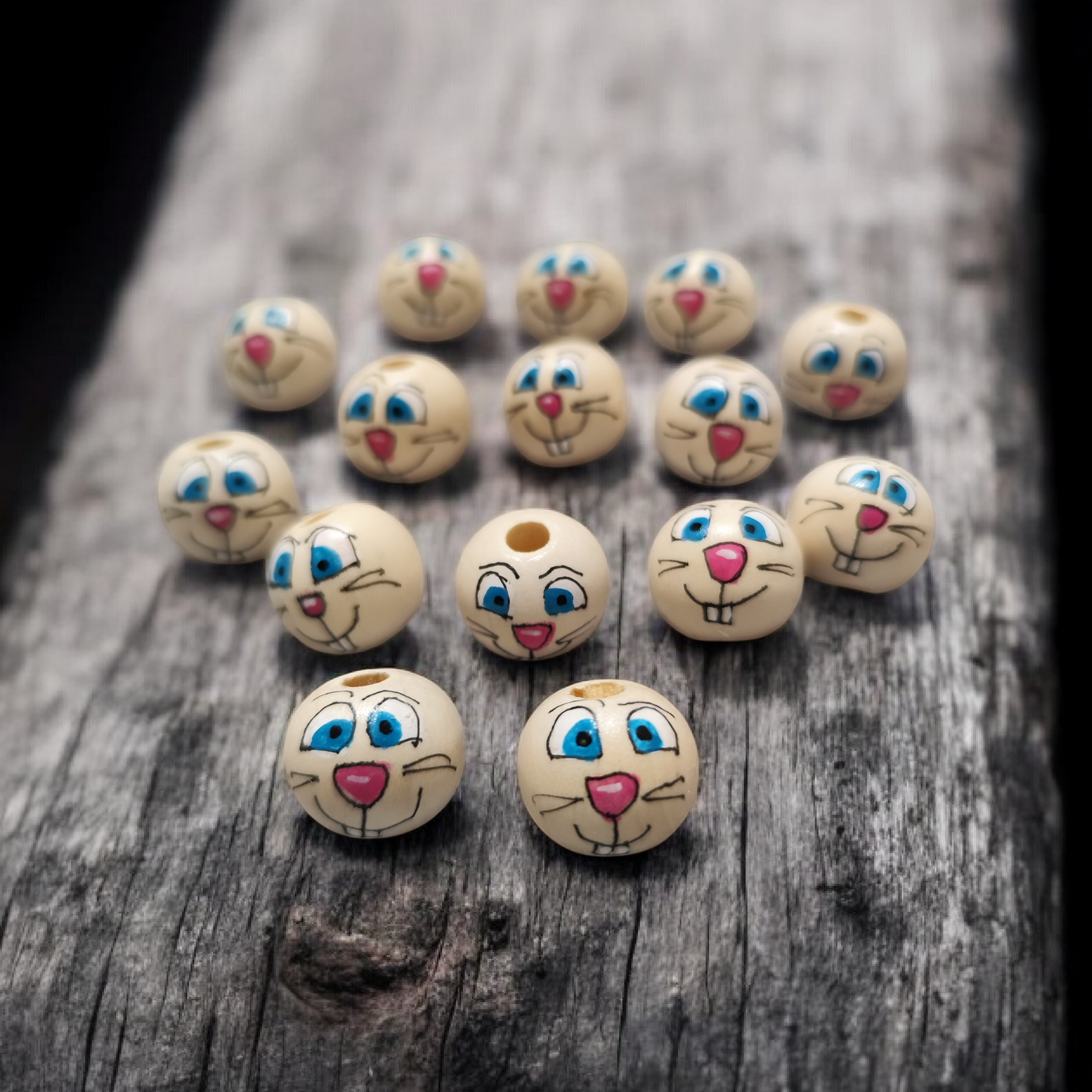 Niedliche Häschen-Gesichter für jeden Anlass! Diese handbemalten Holzperlen zeigen süße Hasen-Gesichter mit freundlichem Blick – komplett bemalt ohne Ohren. Perfekt für Ostern, Frühlings-Projekte, Sorgenwürmchen oder kreative Basteleien.