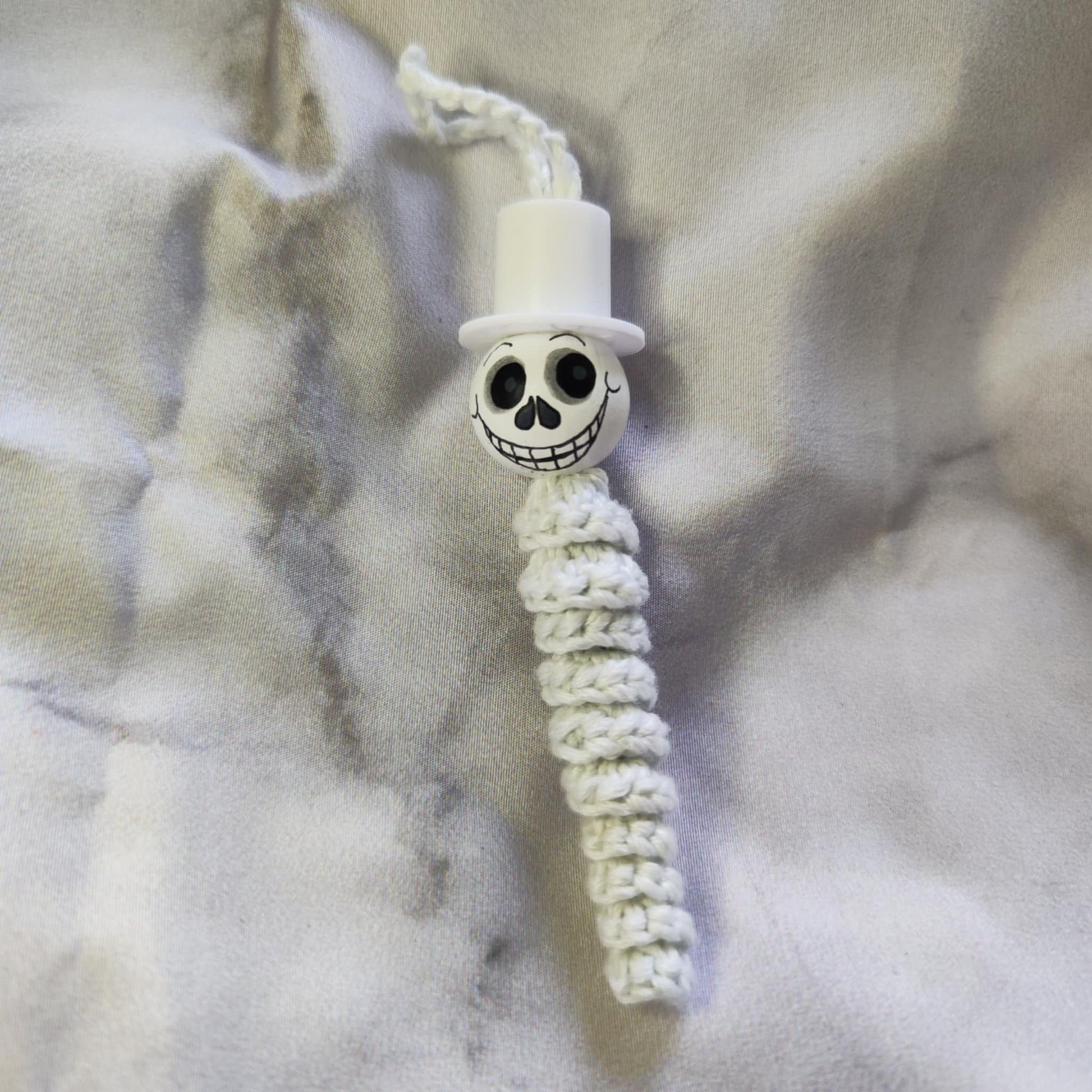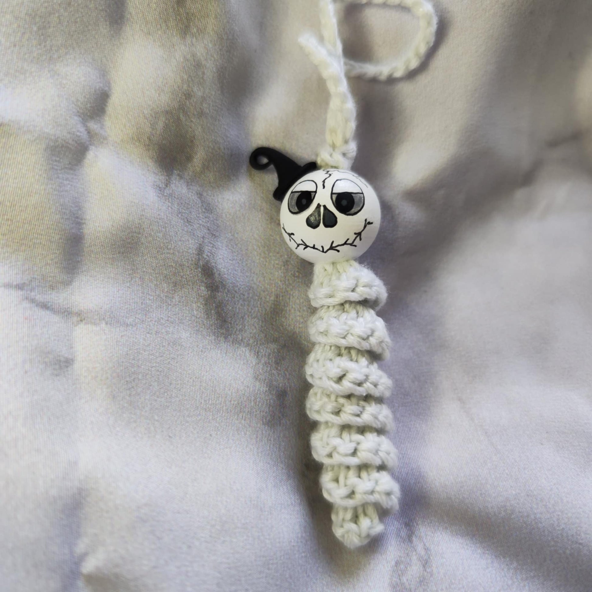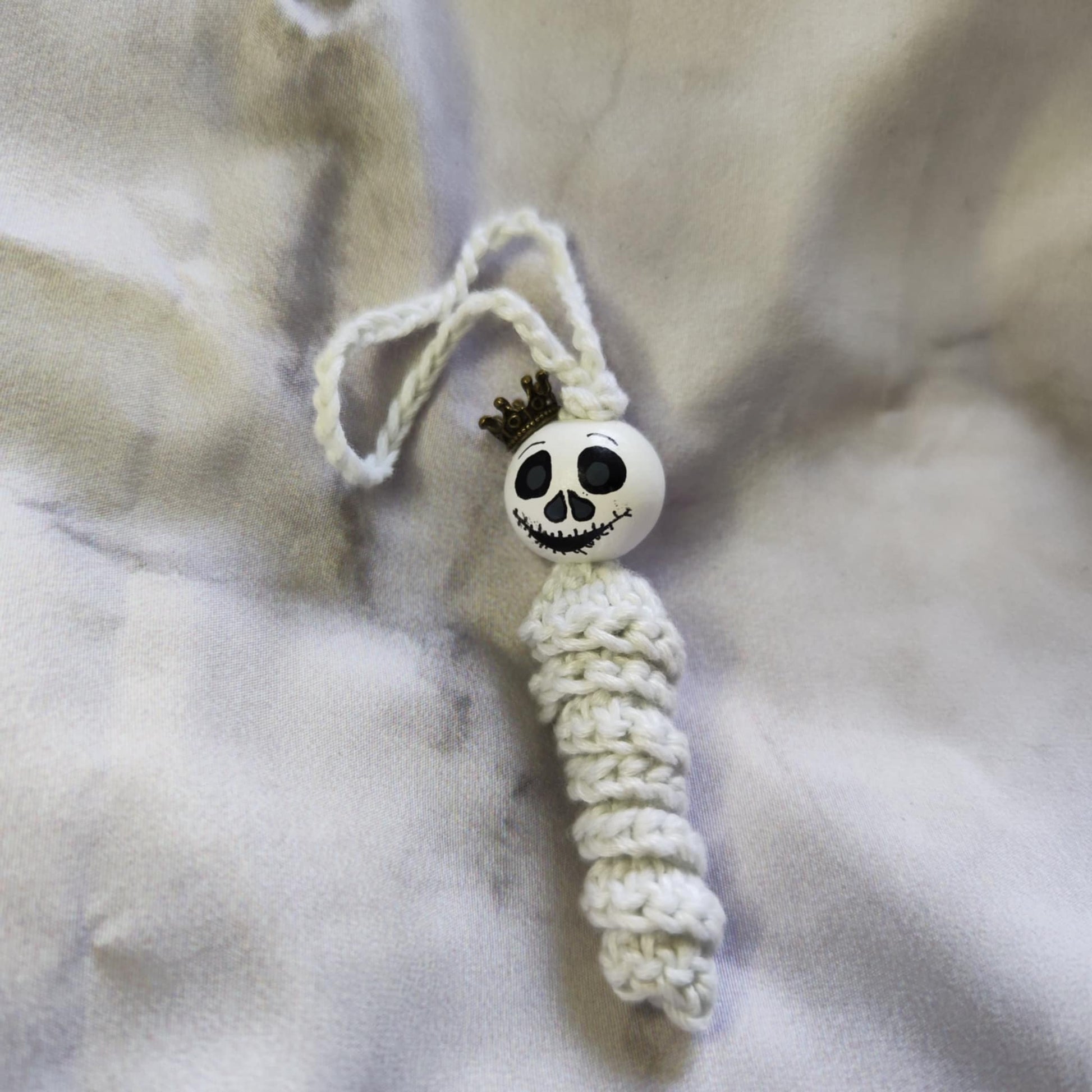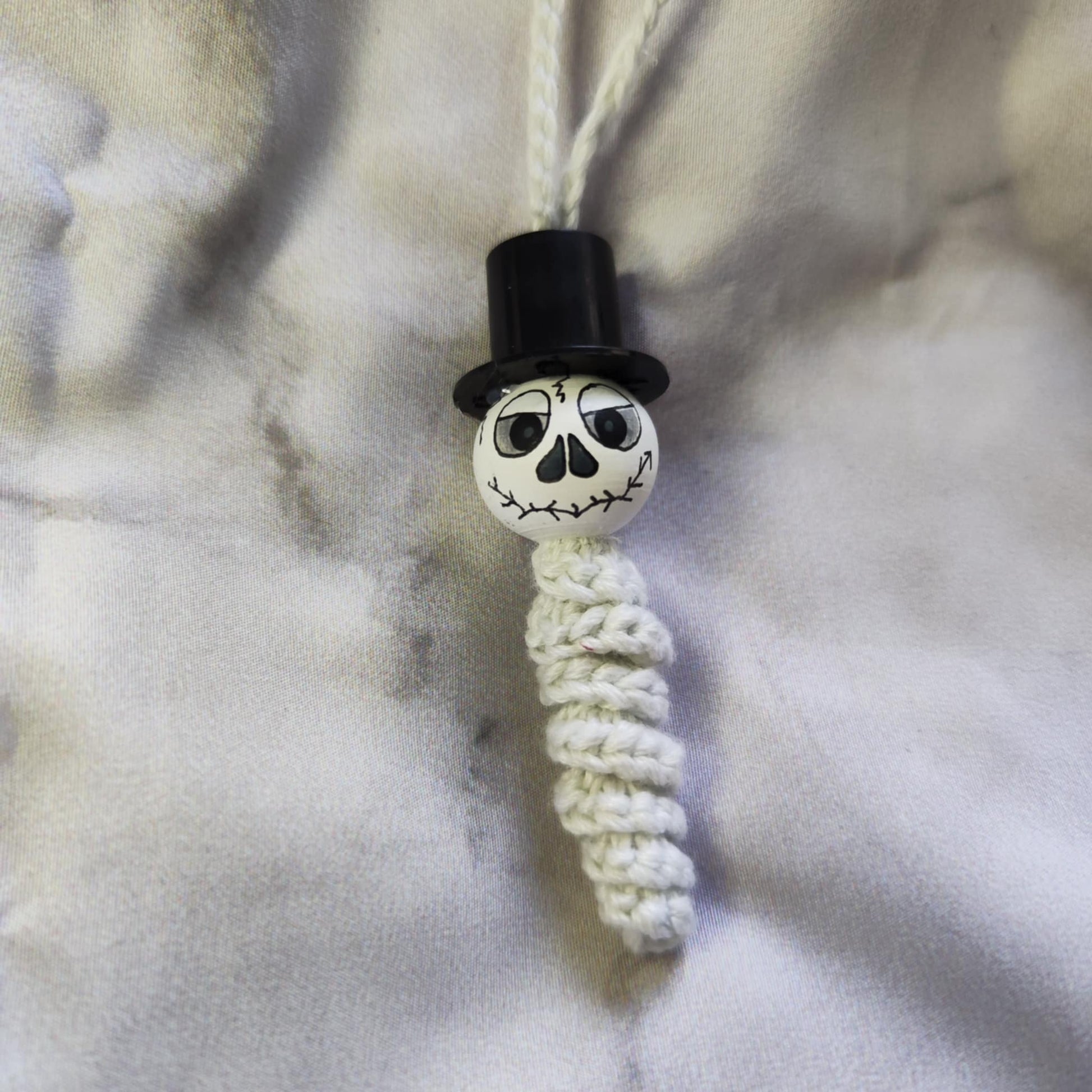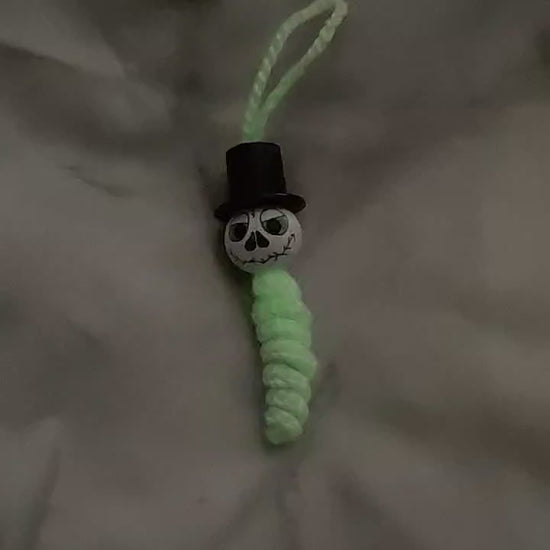 Jedes Würmchen ist liebevoll gefertigt, mit handbemaltem 2 cm Holzköpfchen und kleinen, geisterhaften Details.