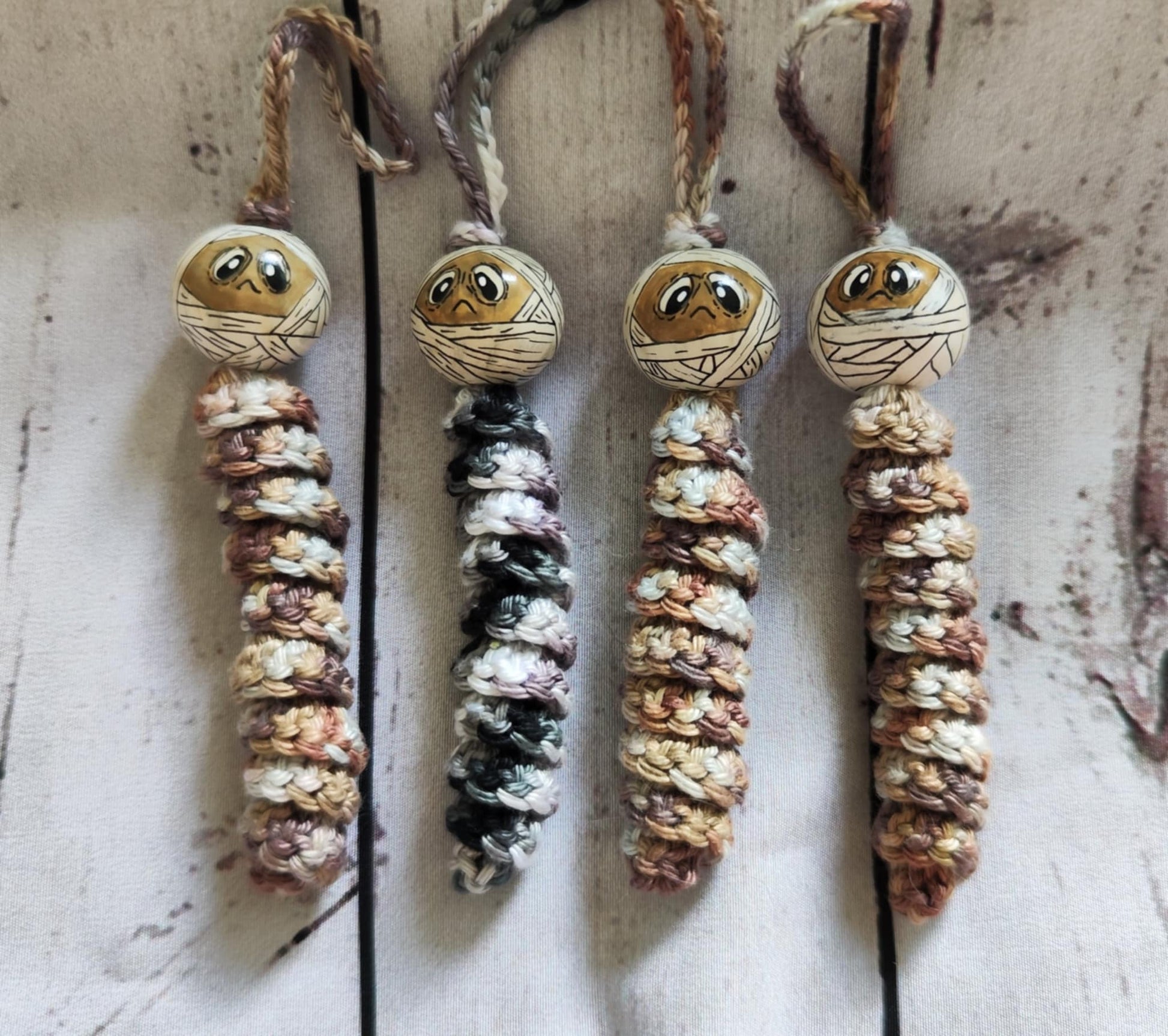 🌑 This worry worm comes straight to you, just like from ancient Egypt: wrapped in white, cream, or grayish "bandages"—just like a little mummy. The 2 cm head is lovingly hand-painted with spooky (or funny!) eyes and a mysterious expression. Perfect for Halloween decorations, mystical collectors, or anyone who needs a wink even in dark times.