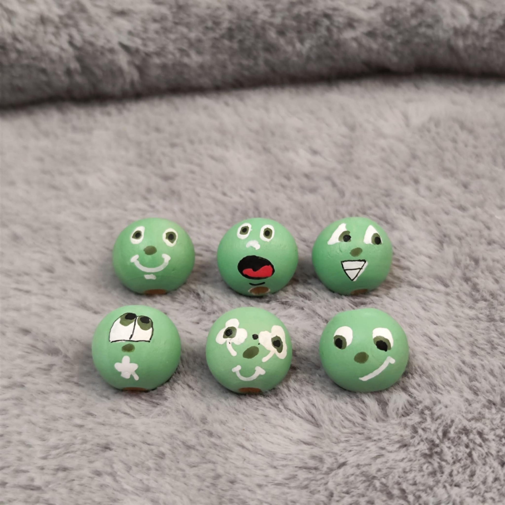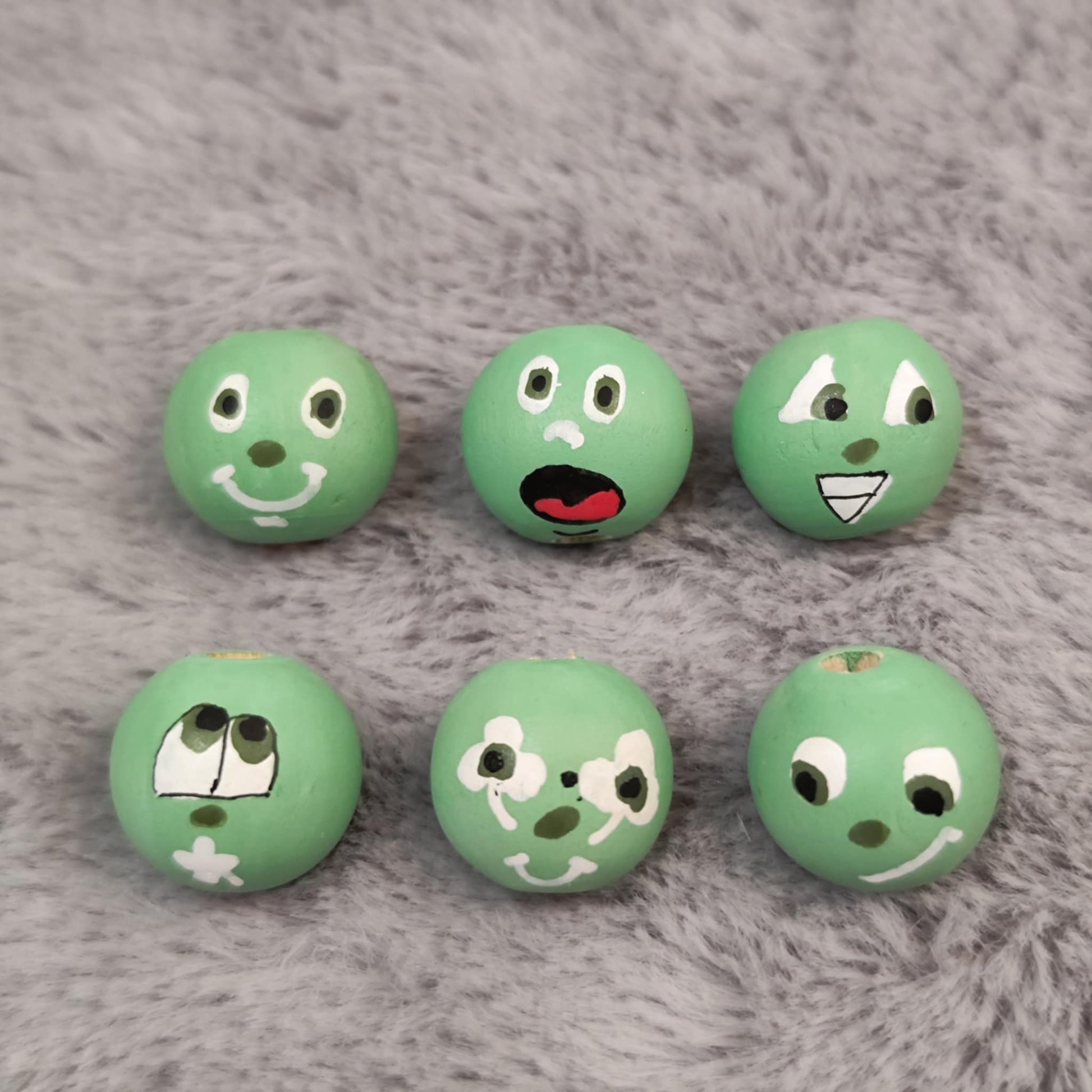 6er Set „Hellgrüne Kleeblatt-Köpfchen“ – handbemalte Holzperlen (lustige Gesichter)