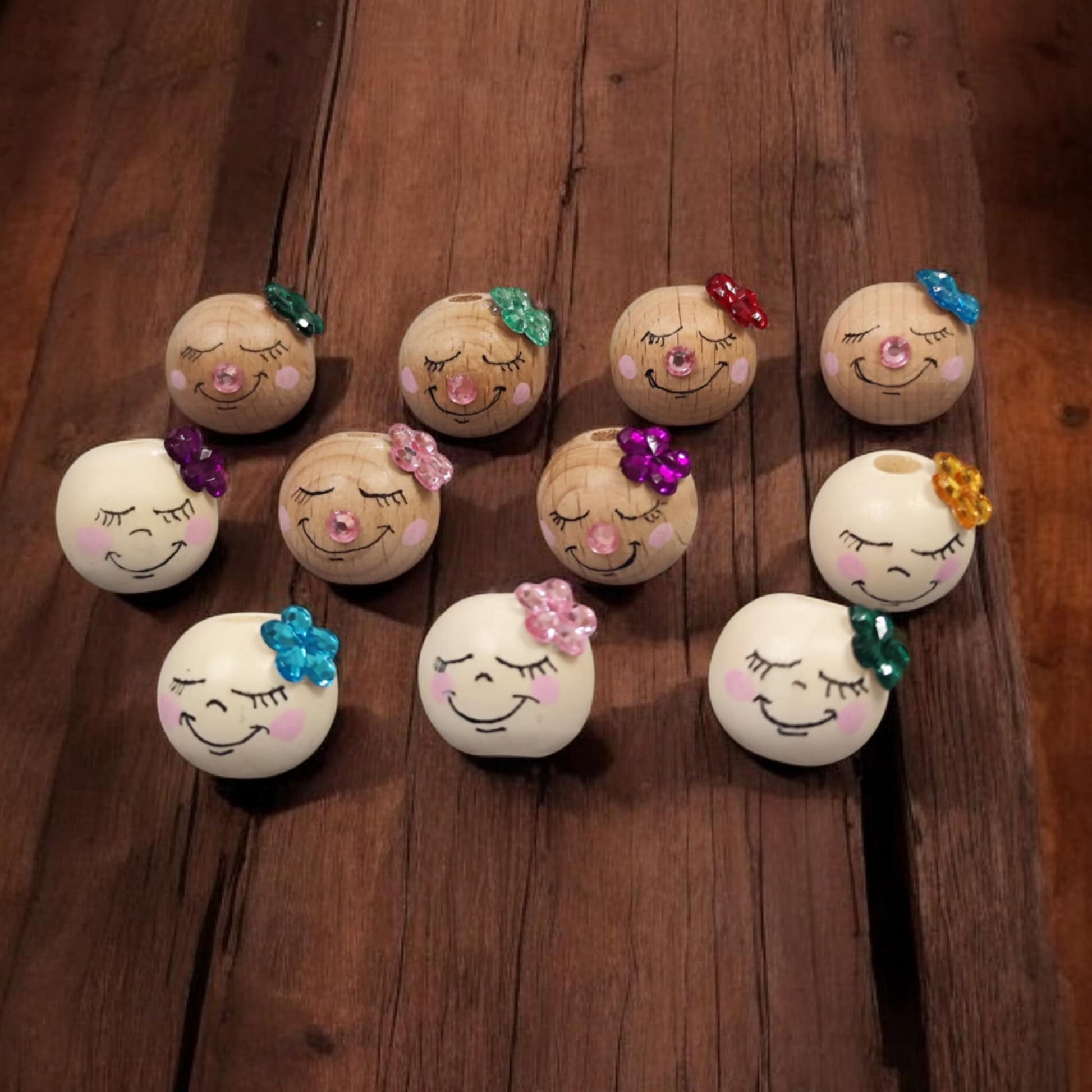 Diese Frühlingsmädchen-Köpfchen stehen für Leichtigkeit, Sanftheit und einen Hauch von Blütenzauber. Jedes Köpfchen wird von mir einzeln von Hand bemalt und zeigt ein friedlich lächelndes Gesicht mit geschlossenen Augen, rosigen Wangen und einer kleinen glänzenden Nase. Als verspieltes Highlight trägt jedes Mädchen eine funkelnde Blüte im Haar. Erhältlich in naturbelassenem Buchenholz sowie in hell/cremefarbenem Holz – beide Varianten bringen ihren eigenen, charmanten Charakter mit.