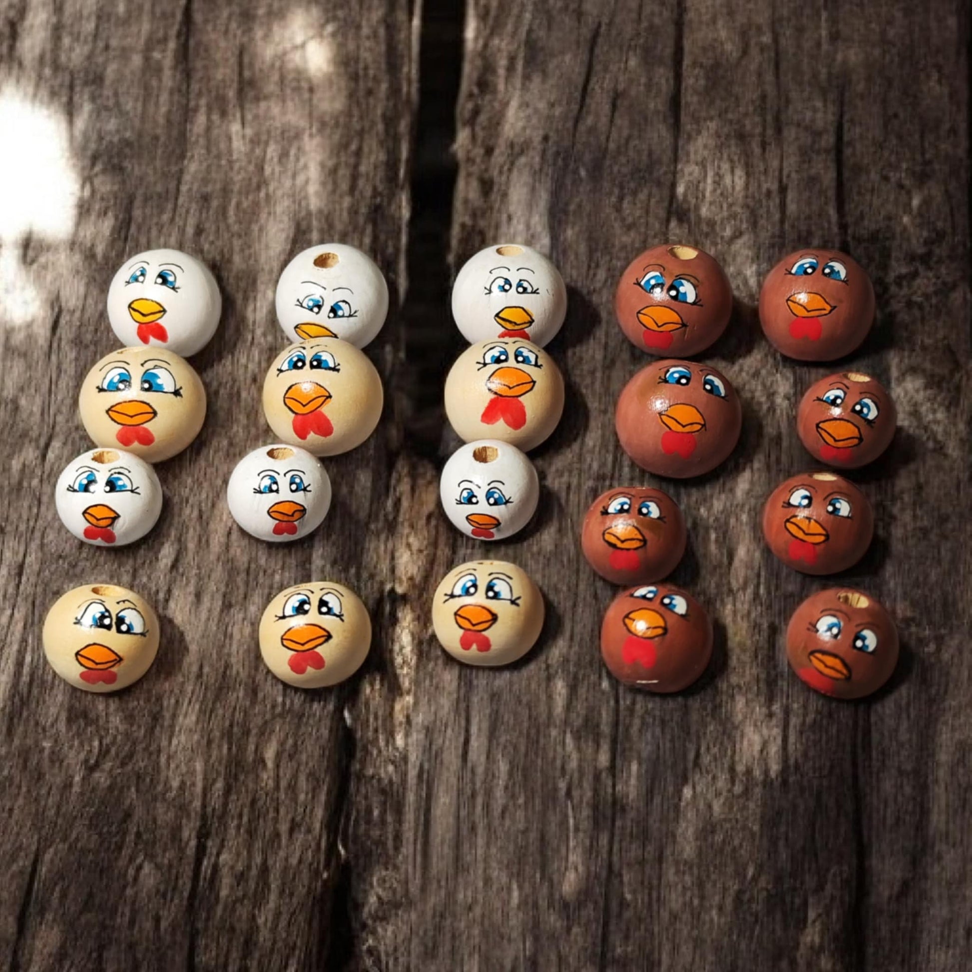 Stolze Gockel für den Bauernhof! Diese handbemalten Holzperlen zeigen fröhliche Hähne mit orangem Schnabel und rotem Kamm – erhältlich in Weiß, Holzfarbe oder Braun. Perfekt für Bauernhof-Fans, Hühnerliebhaber, Sorgenwürmchen oder ländliche Bastelprojekte.