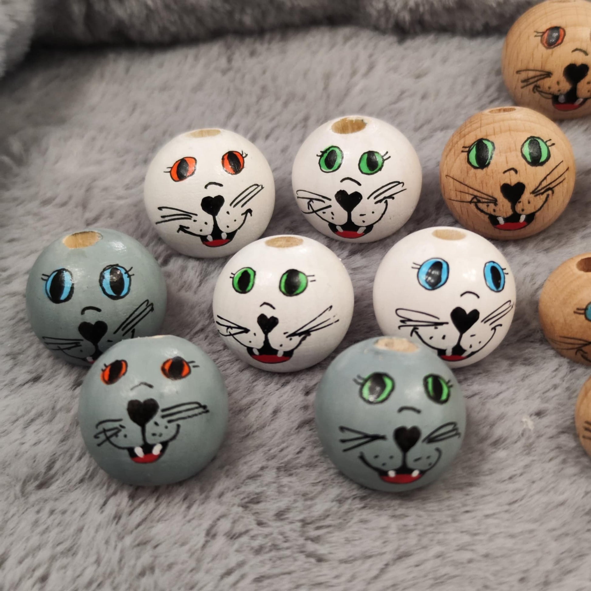 Was macht sie besonders? Jedes Köpfchen wird einzeln von Hand bemalt. Kein Gesicht gleicht dem anderen – jedes hat seinen eigenen Charakter und Ausdruck. Die kleinen aufgemalten Zähnchen und die verschiedenen Augenfarben machen jede Katze besonders ausdrucksstark. Durch die Versiegelung mit speichelfestem Lack sind die Köpfchen langlebig und geschützt.