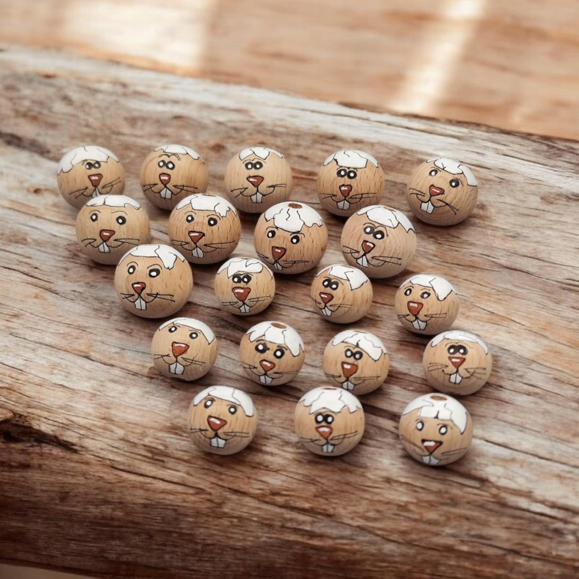 Diese handbemalten Hasen-Köpfchen wirken, als wären sie gerade frisch aus dem Ei geschlüpft. Jedes Köpfchen wird von mir einzeln von Hand bemalt und zeigt ein niedliches Hasengesicht mit großen Augen, feiner Schnauze und einer aufgemalten weißen Eierschale auf dem Kopf. Gefertigt aus Buchenholz bleibt die natürliche Holzmaserung sichtbar und verleiht jedem Köpfchen seinen ganz eigenen Charakter.