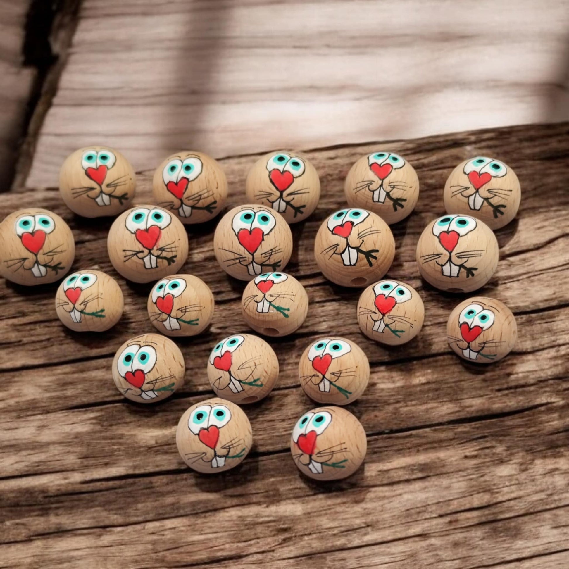 Diese handbemalten Hasen-Köpfchen bringen sofort gute Laune. Jedes Köpfchen wird von mir einzeln von Hand bemalt und zeigt ein fröhliches Hasengesicht mit großen Augen, einer roten Herznase, typischen Hasenzähnchen und einem kleinen grünen Grashalm im Maul. Gefertigt aus Buchenholz bleibt die natürliche Holzmaserung sichtbar und macht jedes Köpfchen zu einem echten Unikat.