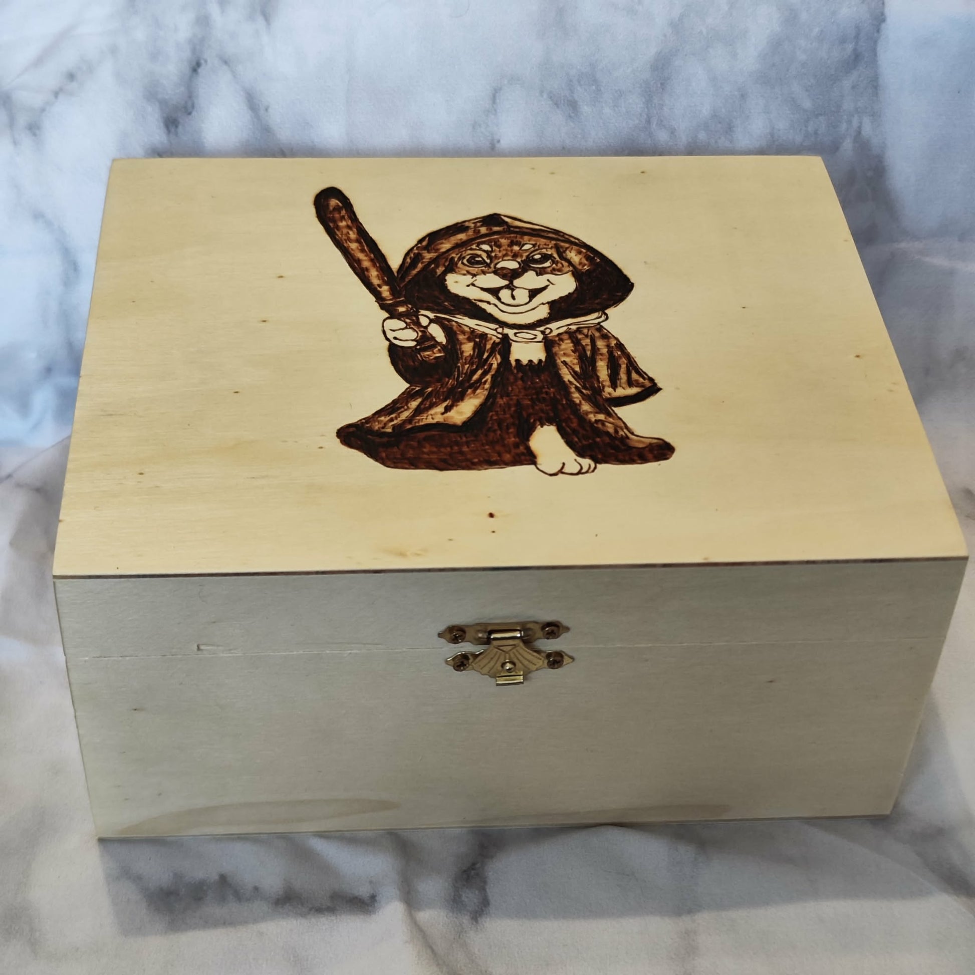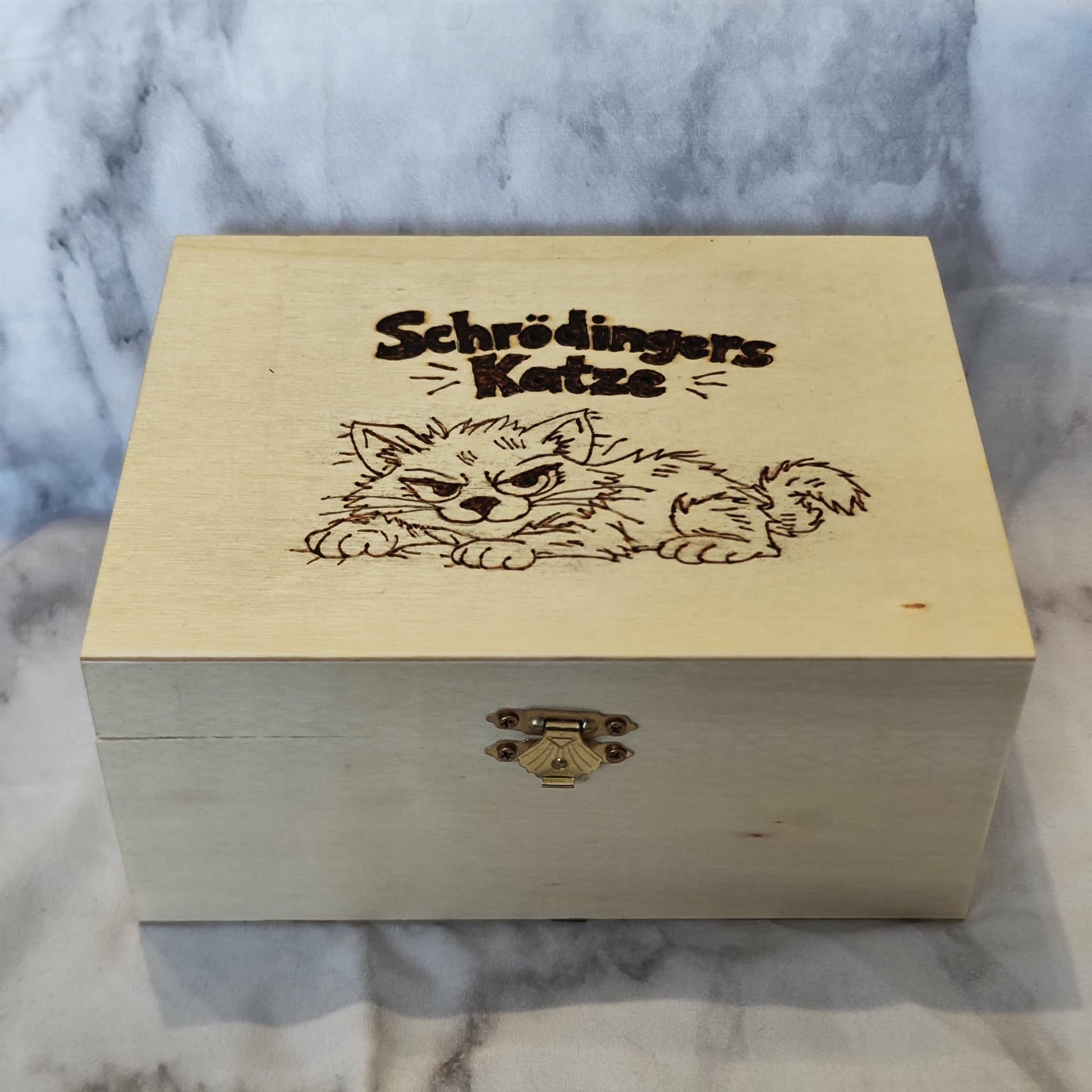 Für alle, die ihre Schätze mit Stil verstauen! Diese handgefertigten Holzboxen aus Pappelsperrholz werden von mir mit detailreicher Brandmalerei veredelt – mit witzigen und liebevoll gestalteten Motiven aus Nerd-Kultur, Fantasy und mehr. Ob Jedi-Katze, Schrödingers Katze oder "Mein Schatz!" – jede Box ist ein Unikat für Fans mit Geschmack.