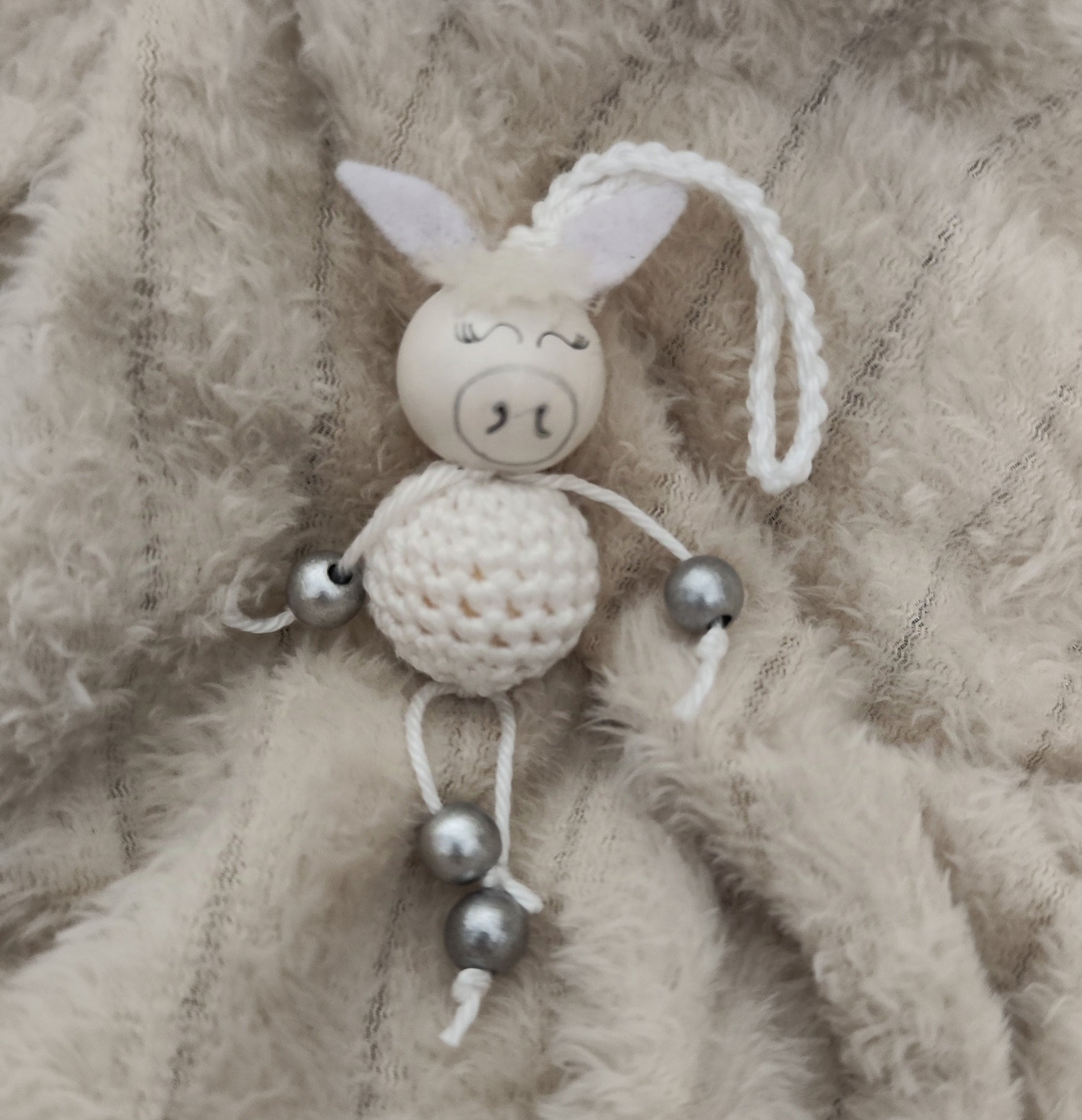 Ein hell gehäkelter Garnkörper, dazu ein handbemaltes Holzköpfchen (2 cm) – das Ergebnis ist ein ruhiger Begleiter, der sich dezent in jeden Raum einfügt und dennoch für liebevolle Momente sorgt.